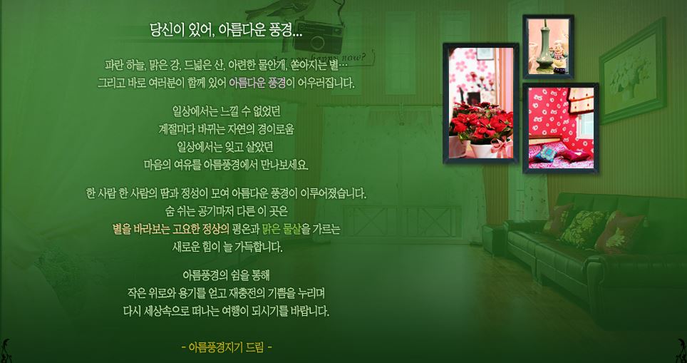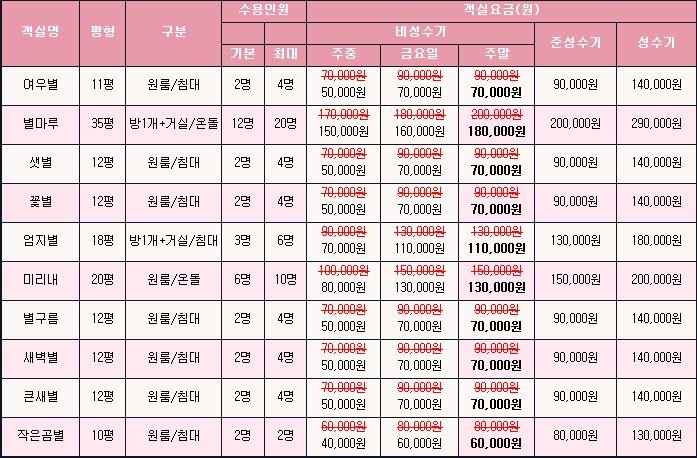 - 객실수 : 총 10실 - 총 수용가능인원 : 30 ~ 50명 - 주 소 : 강원도 영월군 영월읍 삼옥리 1135-1번지 - 동강래프팅(주)와의 거리 : 20분 소요 (10Km) , 픽업불가능 숨쉬는 공기마저 다른 이 곳은 별을 바라보는 고요한 정상의 평온과 맑은 물살을 가르는 새로운 힘이 늘 가득합니다. 고급펜션형