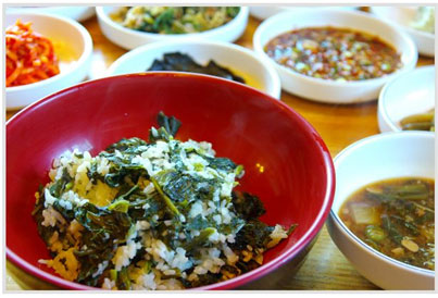 나물 한가지로만 지어낸 밥에 간장 양념만으로 비벼먹는 간소한 상차림이지만 그 맛이 자극적이지 않아 부담없이 즐길 수 있는 음식이다. 음식설명 : 곤드레나물은 학명으로 고려엉컹귀, 곤달비라고 하며 태백산의 해발 700m 고지에서 자생하는 야생 나물로서 담백하고 영양가가 풍부하여 향이 특이한 식물이다. 곤드레나물은 구황식품으로 정선 아리랑 가사에도 등장하는 정선, 평창지역의 무공해 특산물로 매년 5월쯤 채취하여 이용할 수 있어 이를 이용한 음식이 발달하였다. 음식의 영양성 : 곤드레는 부드러운 맛이 있으며, 향기가 없는 것이 특징이다. 곤드레 나물에는 단백질, 칼슘비타민등의 영양이 풍부할 뿐만 아니라 곤드레를 쌀과 섞어서 밥을 지어 양념장과 곁들여 비벼 먹으면 그 맛이 일품이다.